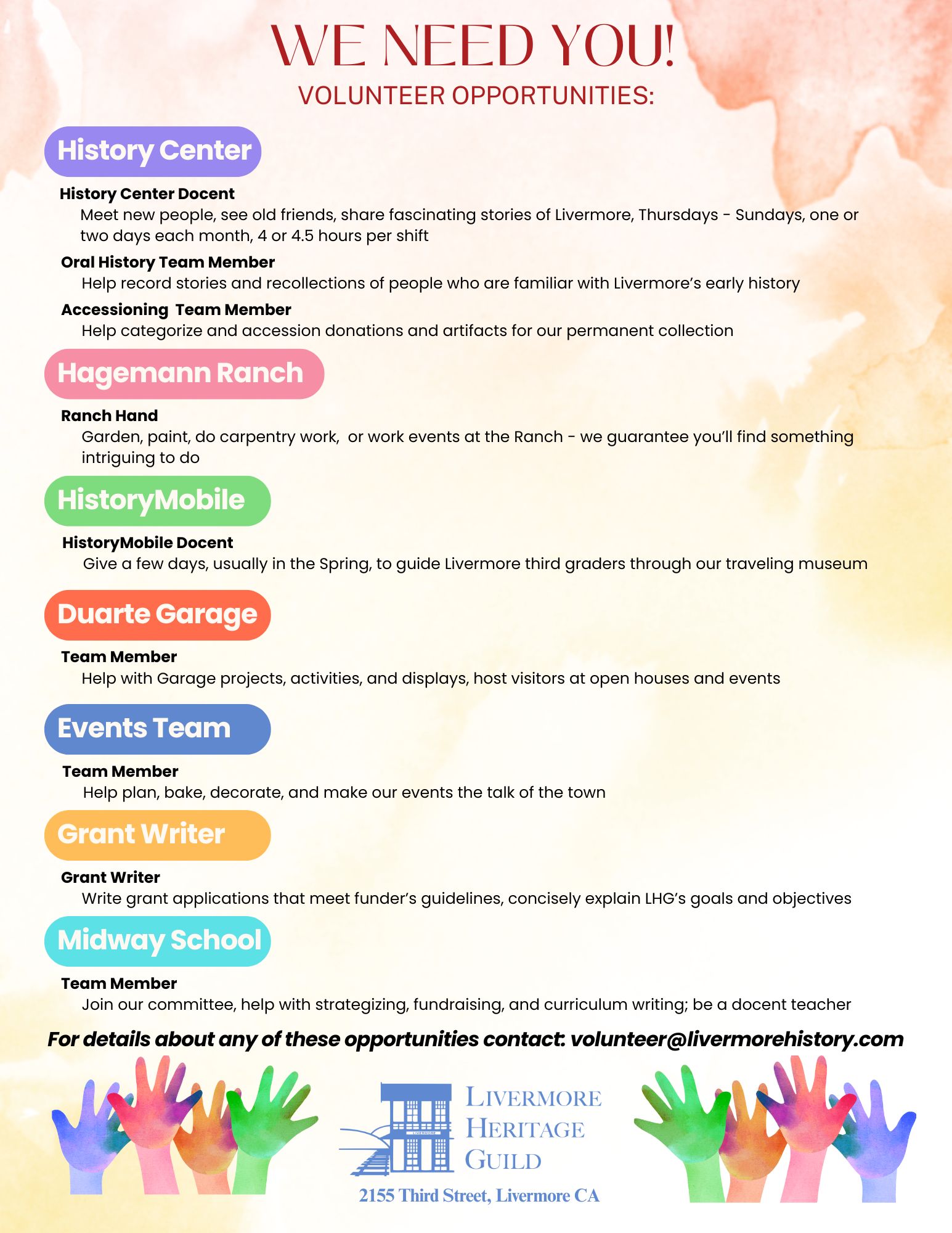 MAJOR DONORS: Please save us 3.5% fee by mailing checks payable to Livermore Heritage Guild directly to PO Box 961
